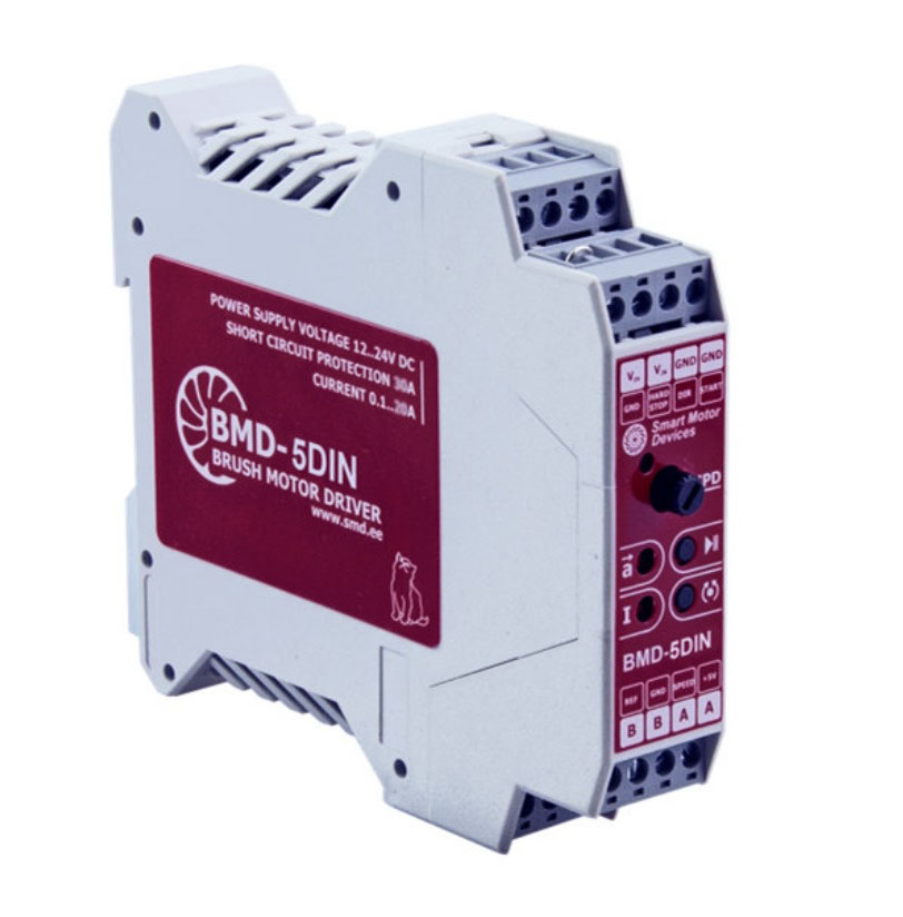 BMD-5DIN - это драйвер, предназначенный для управления скоростью и направлением вращения коллекторного двигателя постоянного тока. Регулирование скорости производится аналоговым сигналом или встроенным потенциометром. Разгон и торможение двигателя задаются встроенными регуляторами.